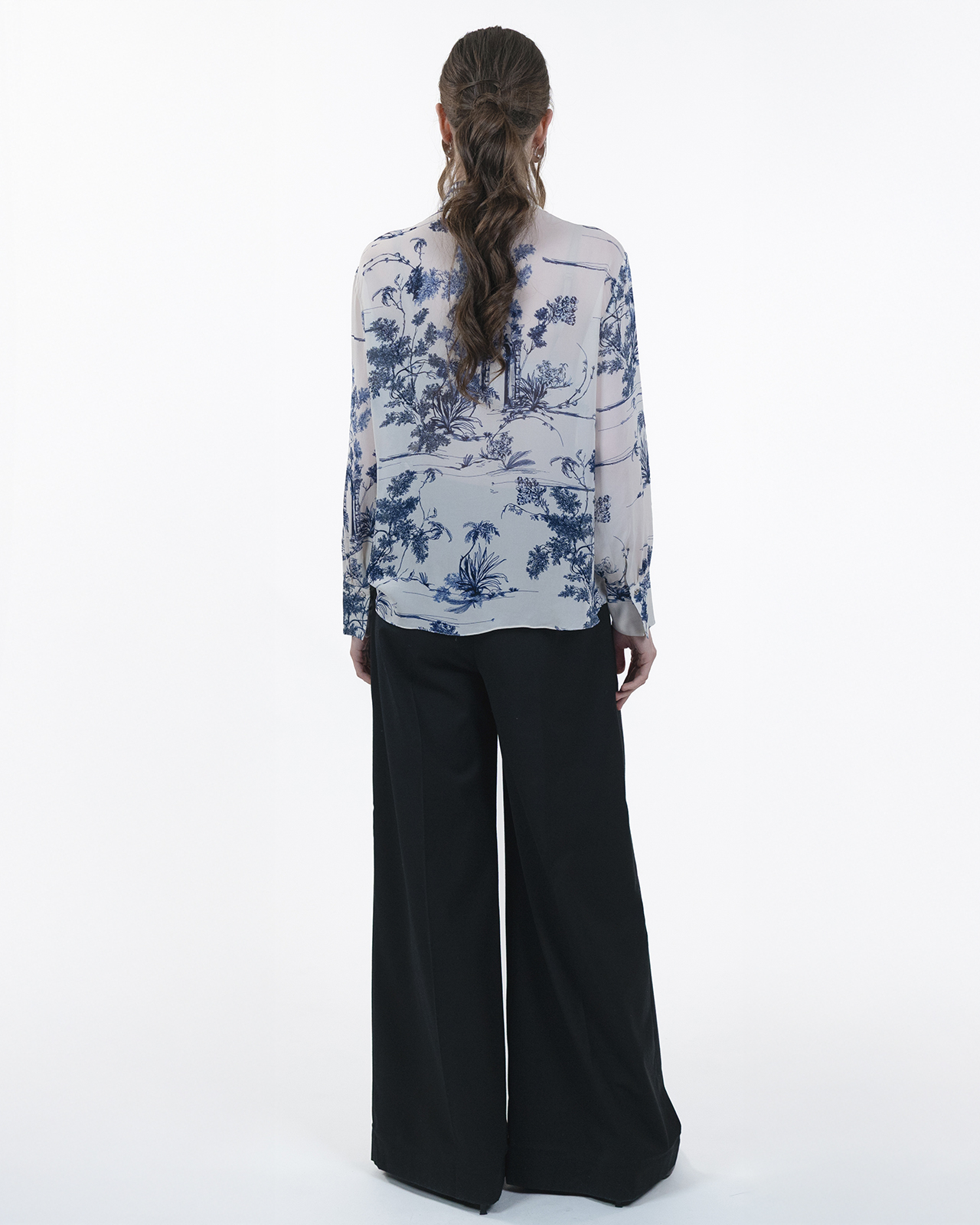 Camasa lejera din voal de vascoza cu print grafic. Guler cu snur detasabil cu detaliu lucrat manual sub forma de floare. Inchidere cu nasturi metalici argintii.