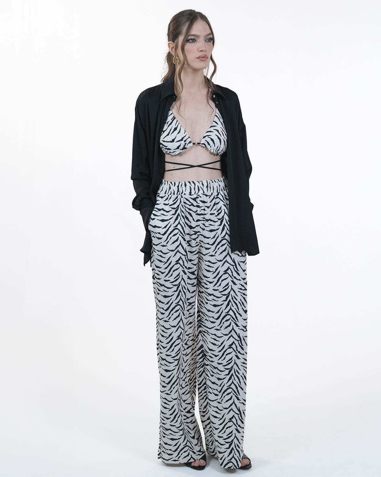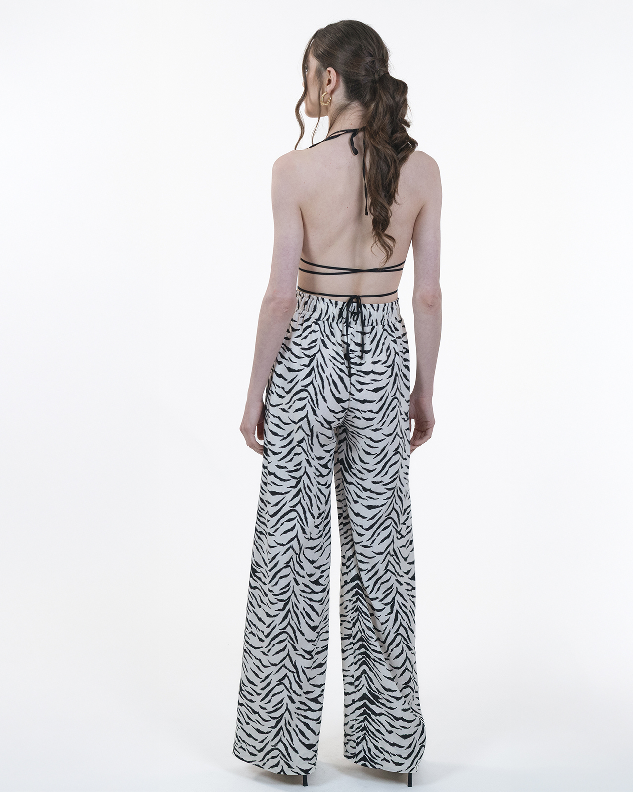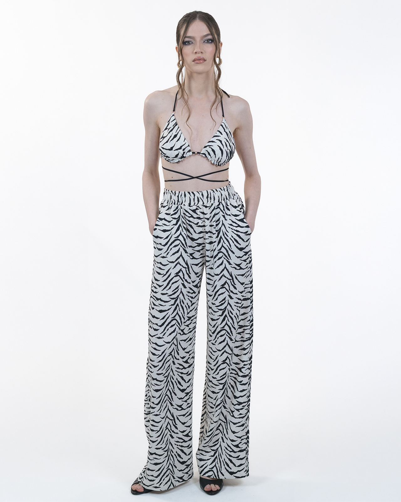 Pantaloni din vascoza cu in, animal print. Croiala lejera cu cordon elastic si buzunare.