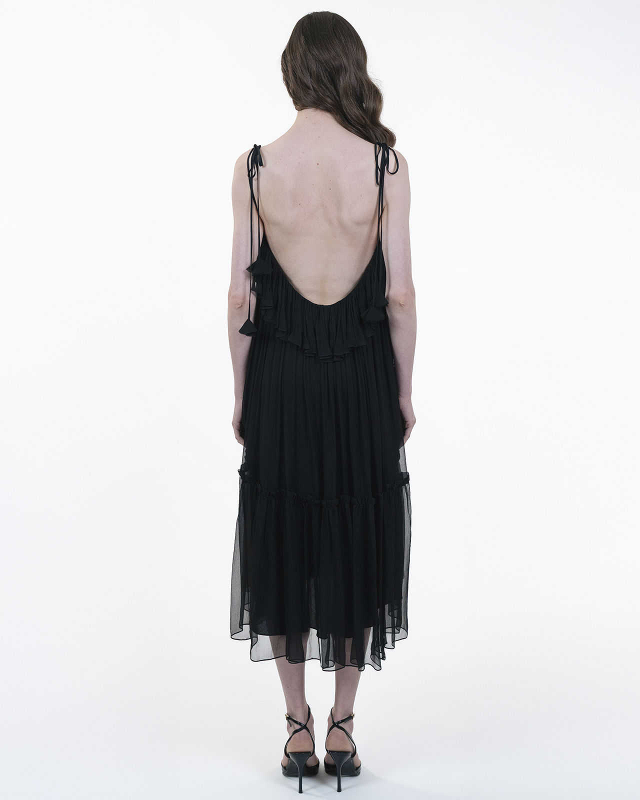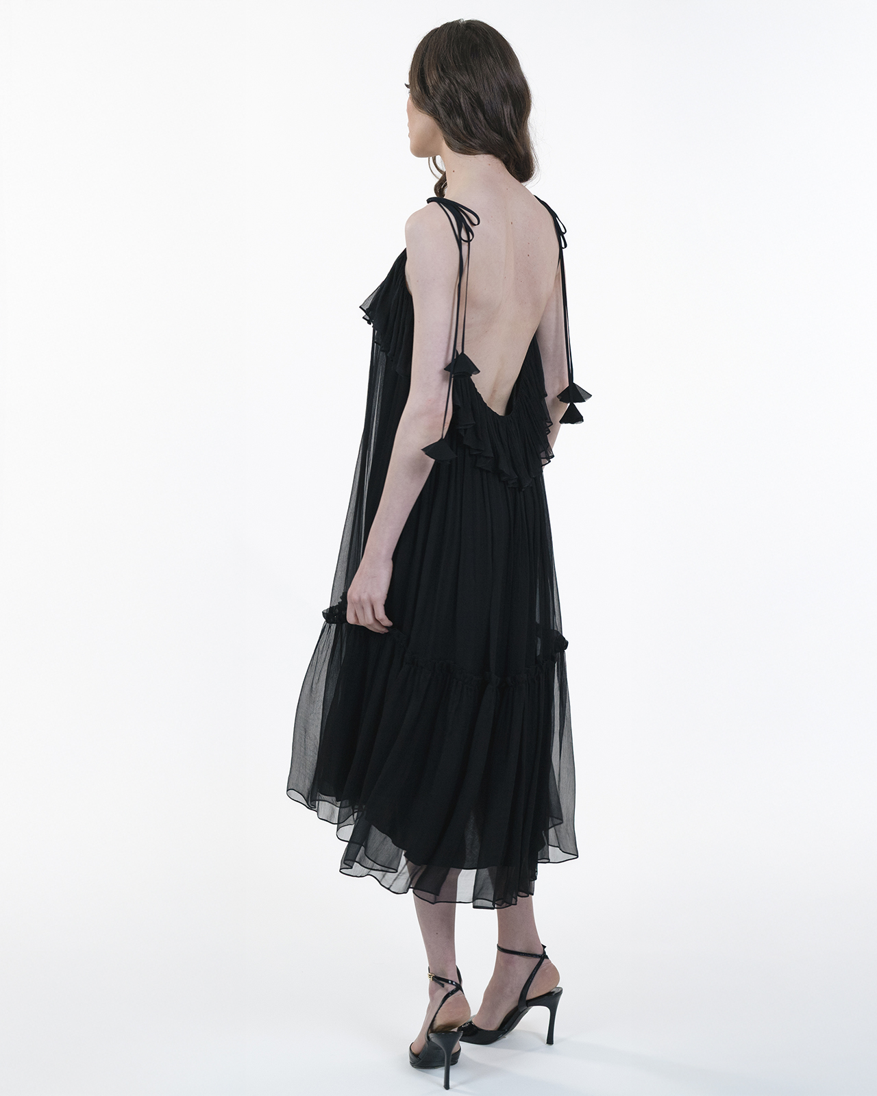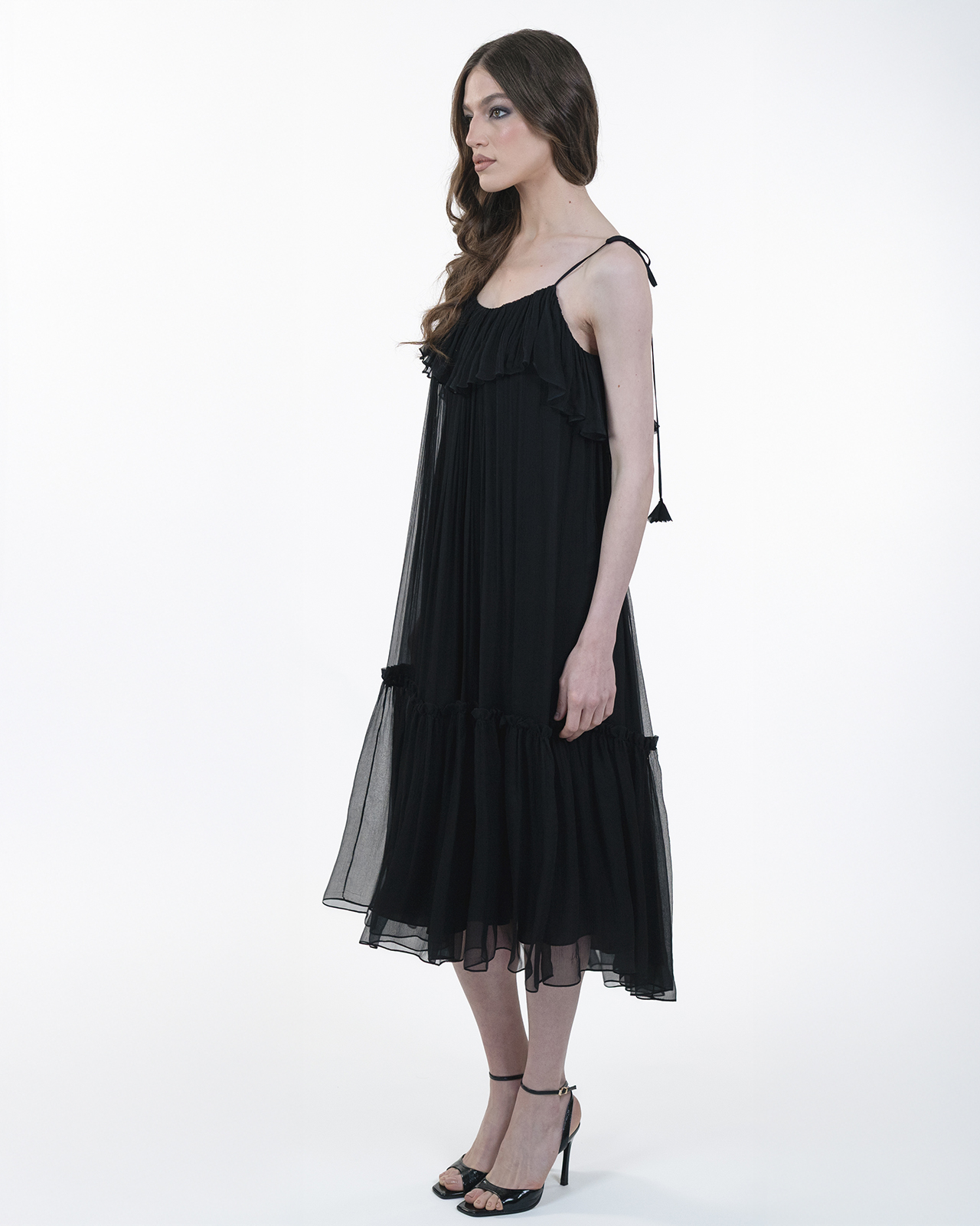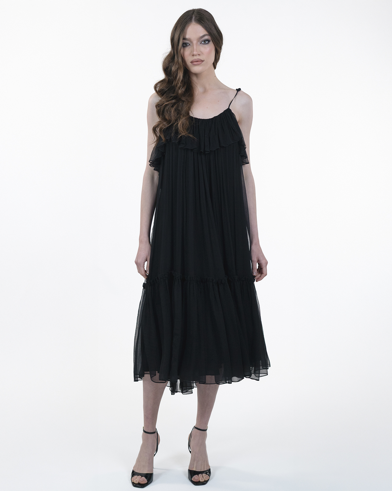 Rochie ampla din matase, cu decolteu adanc pe spate cu volan. Bretele subtiri ajustabile cu detalii lucrate manual sub forma de floare.