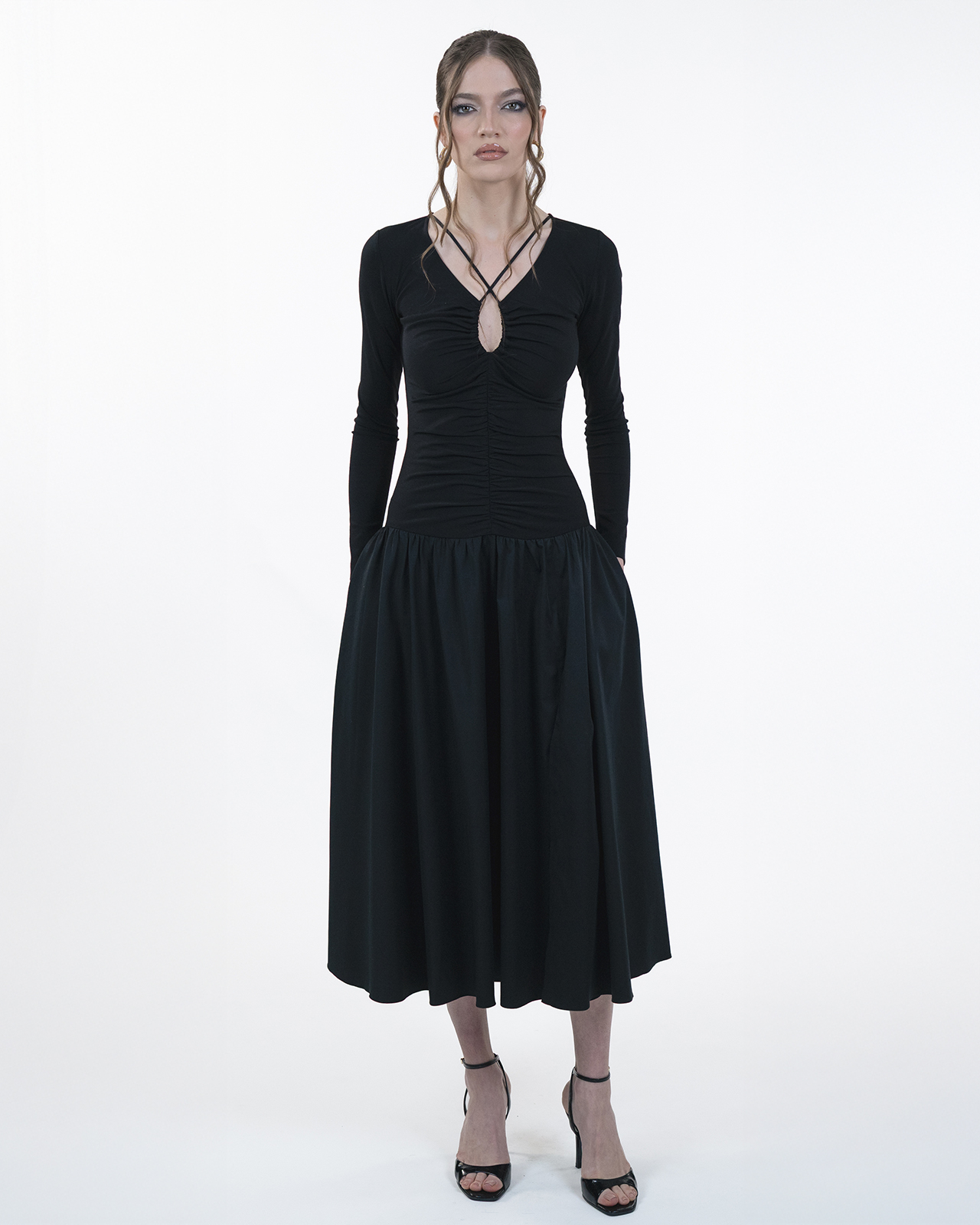 Rochie midi, ampla cu bustul din jerse cu detalii fronsate si talia coborata. Fusta din amestec de bumbac, cu slit pe un picior si buzunare.
